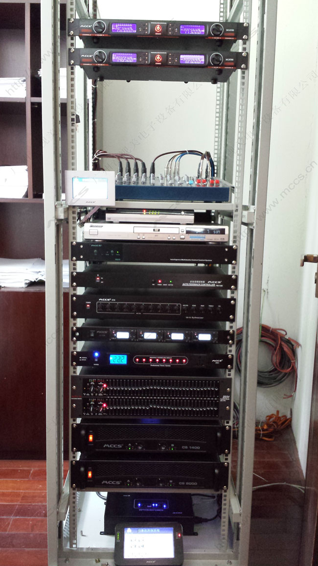 該項目使用了MCCS(音視美)多個設(shè)備。包括:無線觸摸屏控制界面、多媒體中央控制系統(tǒng)、音箱、功放、話筒等。